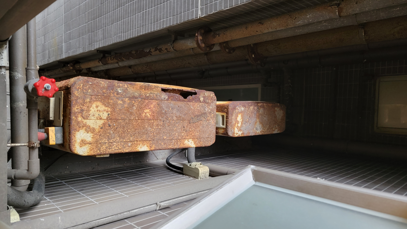 The image below is a perfect example of just how resilient external condenser units are designed to be – it’s hard to believe, but the condenser unit with the massive rusted hole in it is still working (and quite well at that!) whilst the other smaller condenser unit has failed.