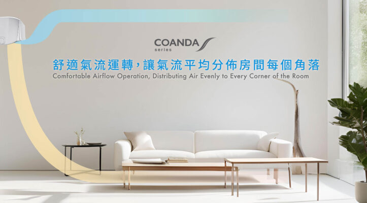 The Coanda Series adopts a special panel design. When Comfort Airflow Operation is activated, the air conditioner applies the Coanda effect, directing airflow along the curved panel towards the ceiling. This allows the cool air to descend naturally, avoiding direct contact with the body while ensuring even distribution of cool air in every corner of the room, maintaining comfort throughout.