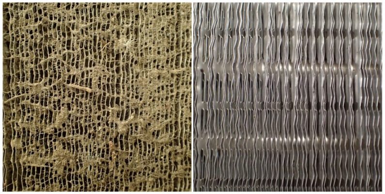 The image below provides an insight into what you should be looking for when visually inspecting the condition of the condenser coil – if there’s heavy levels of dust, mold, grime, or other contaminants, such as the image on the left, then the condenser coil is in need of cleaning