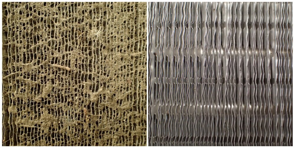 The image below provides an insight into what you should be looking for when visually inspecting the condition of the condenser coil – if there’s heavy levels of dust, mold, grime, or other contaminants, such as the image on the left, then the condenser coil is in need of cleaning